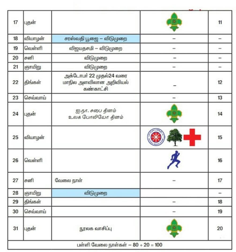பள்ளிக்கல்வித்துறை வருடாந்திர கால அட்டவணையின் படி நாளை ( 27.10.2018 ) சனிக்கிழமை அனைத்து பள்ளிகளுக்கும் வேலை நாள்!