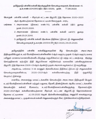 அதன்படி , பார்வை 3 - ல் காணும் இவ்வியக்கக நிதிக்கட்டுப்பாட்டு அலுவலரின் செயல்முறைகளின்படி 2020-2021ஆம் கல்வியாண்டிற்கு நிதி ஒதுக்கீடு பெறப்பட்டுள்ளது. எனவே , அனைத்து மாவட்டங்களில் செயல்படும் அரசு / அரசு நிதியுதவி பெறும் உயர் / மேல்நிலைப்பள்ளிகள் மற்றும் மதுரை , தேனி , திண்டுக்கல் ஆகிய மாவட்டங்களில் செயல்படும் கள்ளர் சீரமைப்பு உயர் / மேல்நிலைப்பள்ளிகளுக்கு தேவைப்படும் 2020-2021ஆம் கல்வியாண்டிற்கான சிறப்புக் கட்டண இழப்பீட்டு தொகைக்கான தேவை பட்டியலை 15.09.2020 க்குள் இவ்வியக்ககத்திற்கு அனுப்பி வைக்குமாறு அனைத்து மாவட்ட முதன்மைக் கல்வி அலுவலர்களும் கேட்டுக்கொள்ளப்படுகிறார்கள்.