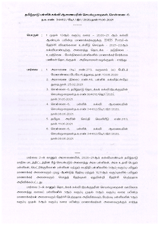 கூடிய மாவட்ட பார்வை 6 - ல் கண்ட செயல்முறைகளின் படி 2021-22ஆம் கல்வியாண்டிற்கு 11 ஆம் வகுப்பு மாணவர்கள் சேர்க்கை குறித்து அறிவுரைகள் வழங்கப்பட்டிருந்தன . 1 முதல் 12 வரை அனைத்து வகுப்புகளுக்கும் அதே வழிமுறைகளைப் பின்பற்றி மாணாக்கர் சேர்க்கையை நடத்த அறிவுறுத்துமாறு மாவட்ட முதன்மைக் கல்வி அலுவலர்கள் கேட்டுக் கொள்ளப்படுகிறார்கள் . 2020-21ஆம் கல்வியாண்டில் அனைத்து பள்ளிகளிலும் 1 முதல் 12 ஆம் வகுப்பு வரை பயின்ற மாணாக்கர்களின் தேர்ச்சி விவரங்களை கல்வி மேலாண்மை தகவல் முறைமை ( EMIS ) இணையதளத்தில் உள்ளீடு செய்வதற்கான வசதி தற்போது ஏற்படுத்தப்பட்டுள்ளது.