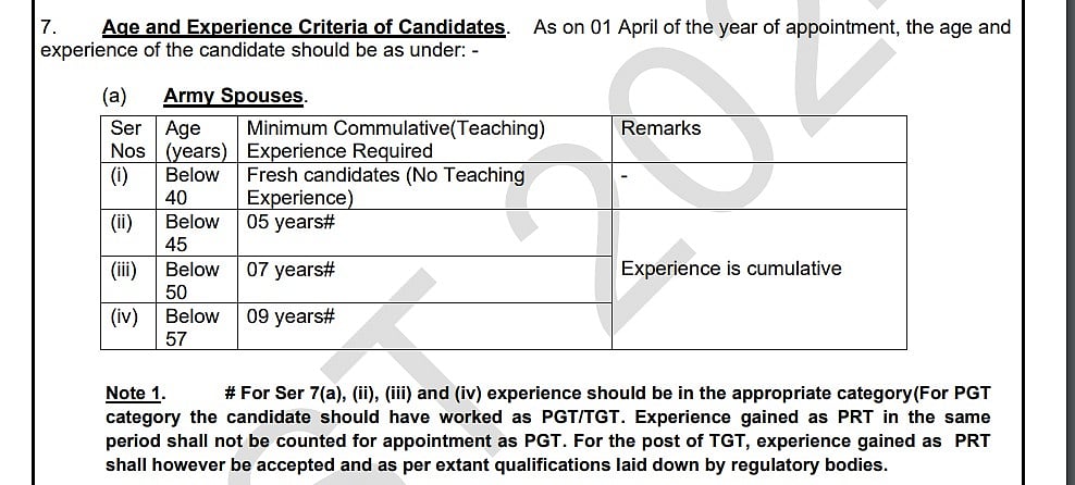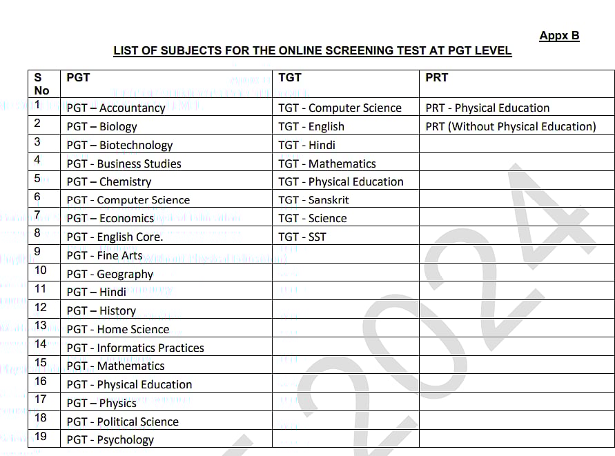 TGT பணிக்கு சம்பந்தப்பட்டபாடத்தில் இளநிலைப் பட்டம் பட்டம் பெற்றிருப்பதுடன் B.Ed. பட்டம் பெற்றிருக்க வேண்டும். அதாவது, Computer Science, English, Hindi, Mathematics, Physical Education, Sanskrit, Science, SST போன்ற ஏதாவதொரு பாடப்பிரிவுகளில் இளங்கலை பட்டம் மற்றும் பி.எட் முடித்தவர்கள் பயிற்சி பட்டதாரி ஆசிரியர் பணியிடங்களுக்கு விண்ணப்பிக்கலாம்.