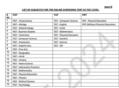 PGT பணிக்கு சம்பந்தப்பட்ட பாடப்பிரிவில் முதுநிலைப்பட்டம் பட்டம் பெற்றிருப்பதுடன் B.Ed. படித்திருக்க வேண்டும். அதாவது, Accountancy, Biology, Biotechnology, Business Studies, Chemistry, Computer Science, Economics, English Core, Home Science, Information Practices, Mathematics, Physical Education, Physics, Political Science, Psychology போன்ற பாடப்பிரிவுகளில் முதுகலை பட்டம் பெற்று, பி.எட் முடித்தவர்கள் முதுகலை பட்டதாரி ஆசிரியர் பணியிடங்களுக்கு விண்ணப்பிக்கலாம்.